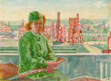 Prisoner Andrei Vingorsky's painting of a Smolensk female guard in uniform holding a gun across her lap with a view of a city behind her. Prisoner…