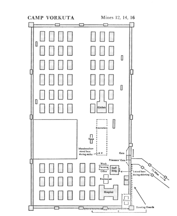 Plan of camp zone at Vorkuta showing layout of various buildings within the fenced zone and highlighting locations of some prisoners and shooting guards during a camp strike.