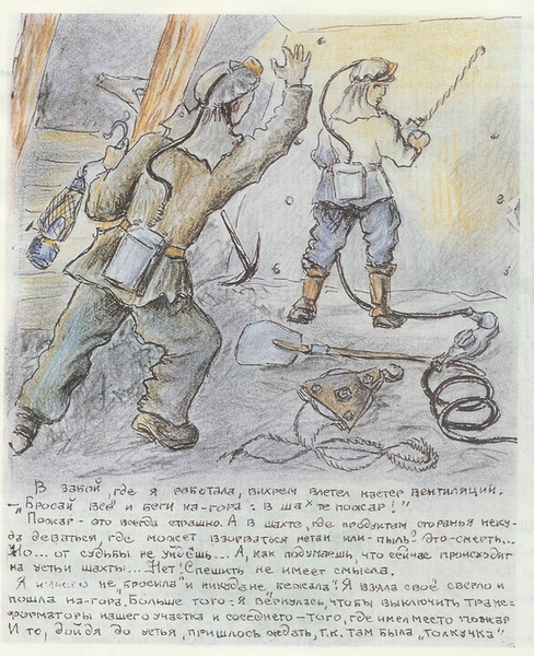 Color sketch from Evfrosiniia Kersnovskaia's self-illustrated memoirs of two miners working with lanterns and pneumatic drills. In the accompanying text, Kersnovskaia recalls an episode when she was working in a mine and one of the construction managers informed her about a fire in the mine. She did not panic, but calmly cleaned her working space and left.