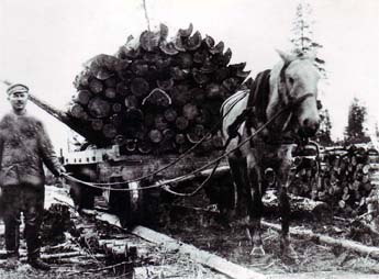 Black and white photograph of horse cart (grabarka) carrying firewood along wooden tracks. The cart has metal wheels that run on rough wooden rails.