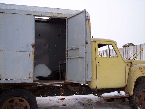 A Black Maria or Black Raven--a truck specially equipped with tiny prison cells for hauling prisoners around while appearing to be a regular delivery truck. This Black Maria is in the collection of the Gulag Museum at Perm 36.
