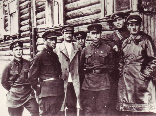 Black and white photograph of a group of chief officials visiting the village of Povenets in the Summer of 1932.