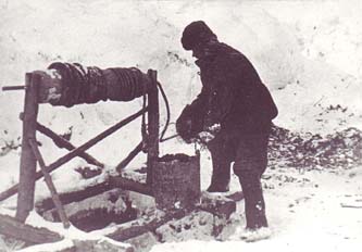Black and white photograph of a prisoner in heavy clothing hauling a water bucket from a well near the mine's gate at Kolyma, Magadan region.