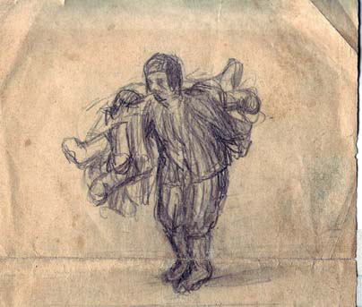 Mkrtchan's pencil drawing reveals the stark reality of a prisoner whose daily labor included carrying back a prisoner who did not survive the day in Ivdellag.