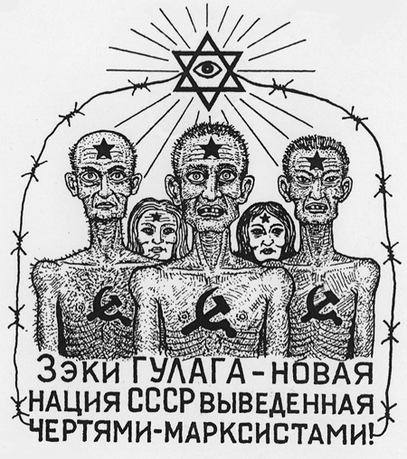 The professional criminals in the camps were known for their heavily tattooed bodies. The tattoos often included political, racist and sexist content. This tattoo uses anti-Semitic symbols presumably to tie Communists and Jews together into a single vision of oppressive overseers. The text reads "The convicts of the GULAG are a new nation of the USSR born of the Marxist devils!" Drawn in the Pechora camp system.