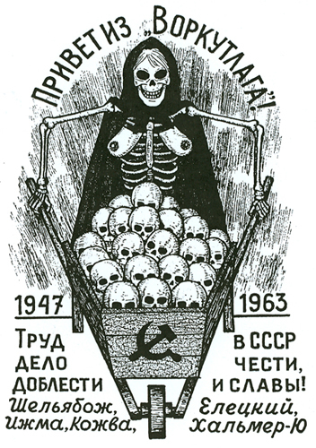 Professional criminals in the camps used their tattoos as a marker of their status. This sketch of a former Vorkuta convict's "grin" tattoo reveals that he is an experienced prisoner, having survived some of the toughest camps. It shows that he had passed through five corrective labor colonies from 1947 to 1963. The tattoo was made in 1962, the year before he was released. It also juxtaposes the grotesquely sexualized image with a text that recalls the Gulag's propaganda. The text reads "Greetings from the Vorkuta camps! 1947-1963. In the USSR labor is a matter of honor, valor and glory! Shelyabozh, Eletsky, Izhma, Kozhma, Khalmer-South."