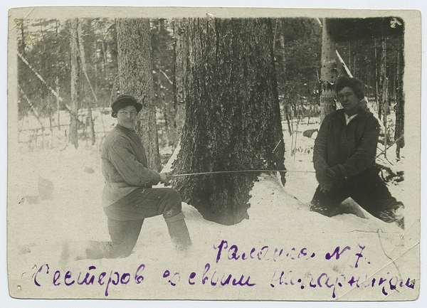 Black and white photograph of two men kneeling in the snow on opposite sides of a tree, They are holding a saw between them. The photograph has writing in Russian in blue ink: "Sesterov with His Partner". Timber was one of the most important Gulag industries, and prisoners worked at it through all seasons with primitive manual tools.