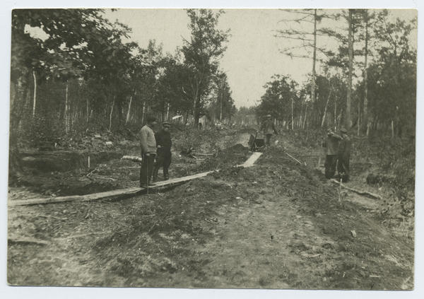 Black and white photograph of five men working in a forest clearing. The make shift board path for pushing the wheelbarrel through the soft earth is apparent.