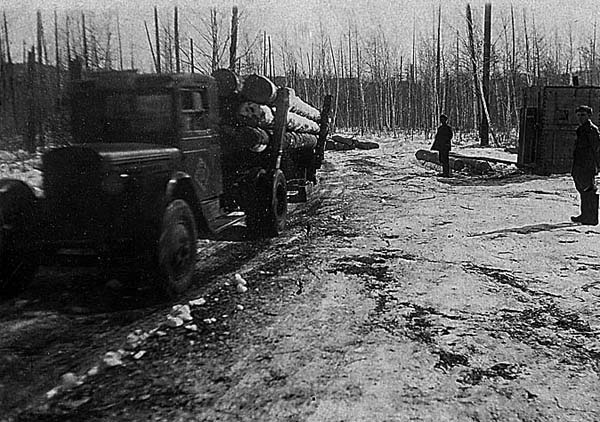 Black and white photograph of a loaded lumber truck driving away from a Gulag logging site.