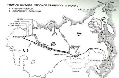 Map of Thomas Sgovio's two journeys. One journey took him from Moscow to Magadan, the other from Moscow beyond the Ural Mountains to Boguchani in Siberia.