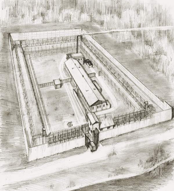 Illustration depicting an aerial view of Maximum Security Camp, Perm 36 as it existed in its final years of operation between 1980-1989.