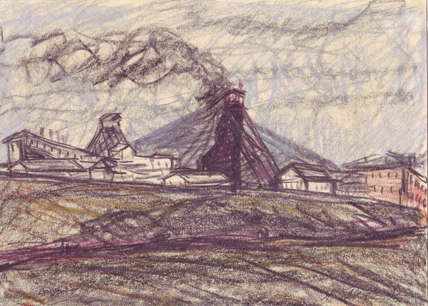 Andreeva color crayon sketch illustrating the mine at Vorkuta.