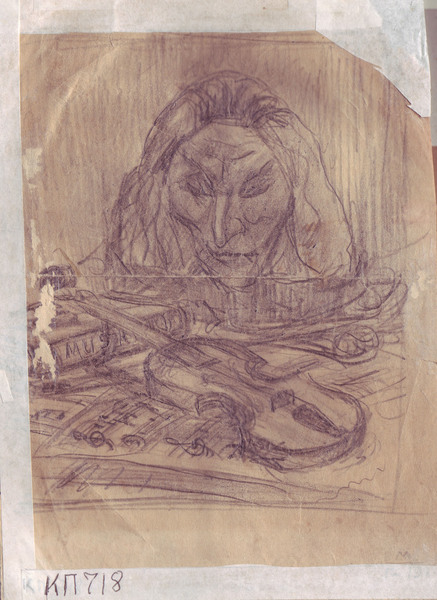 Sketch depicts violin, music books, and a prisoner's face.