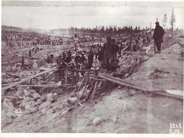 Black and white photograph of prisoners clearing and hauling rocks in wheelbarrows from the site of the White Sea Canal.