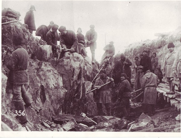 B lack and white photograph of male prisoners breaking up rock watched by guards at the construction of Belomorkanal. The 141 mile White Sea - Baltic Sea Canal was largely built with manual labor using precisely the type of crude tools visible in this photograph.