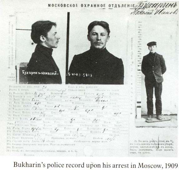 This document contains Nikolai Bukharin's arrest record and black and white photographs of Bukharin from his arrest in Moscow, 1909.