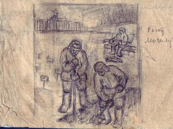 Pencil drawing by Mkrtchan depicting prisoners digging a grave in frozen ground at Ivdellag camp.
