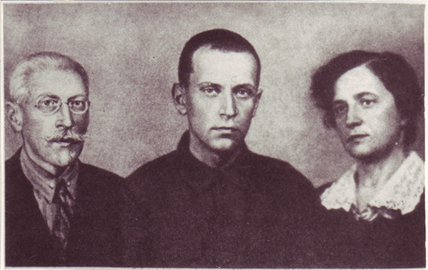 Prisoner Dmitrii Likhachev (future famous scholar) with his parents during meeting. Solovki, 1929.
