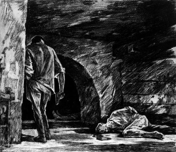 Sketch by Michail Distergeft. Families who sought information on the fate of family members who had been executed were often greeted with the lie that their loved one had been sentenced to a forced labor camp "without the right of correspondence." Consequently, the phrase become a synonym for execution in prisoner language. In the sketch, a guard with a gun stands looking down at a prisoner who has been shot in the head.