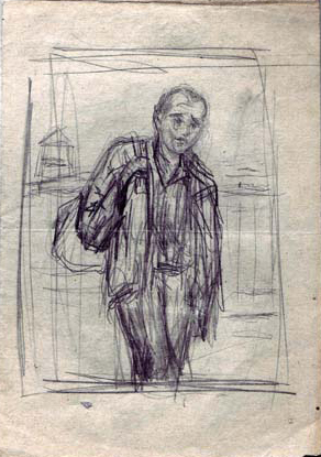 Drawing by Beniamin Shavarshovich Mkrtchan depicting a prisoner leaving a camp with his belongings.