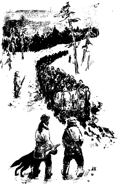 Sketch by an unknown artist depicting a column of prisoners marching through winter conditions to their work sites. Armed guards with attack dogs watch over the prisoners.