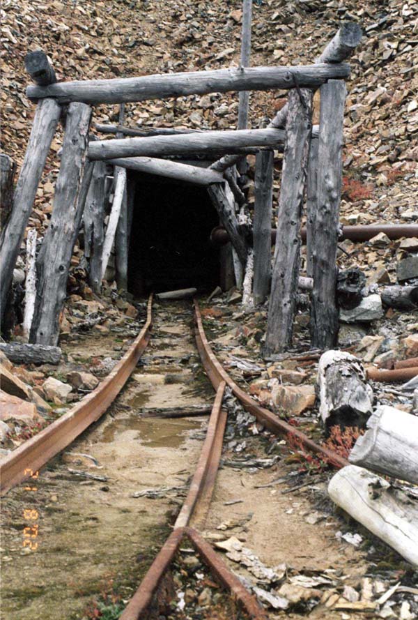 Photograph of mine shaft opening with tracks and wooden framework. Kolyma, 2002.
