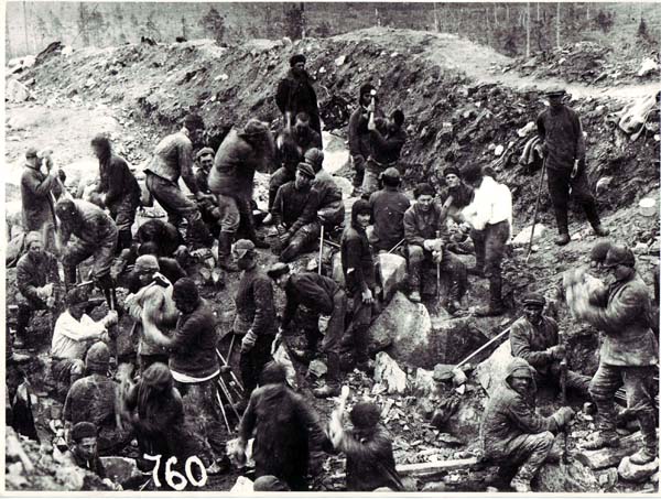 Black and white photograph of a large group of prisoners using iron rods, chisels, and sledge hammers to break boulders in the construction basin at the Belomorkanal labor camp during spring 1932. The 141-mile canal was built almost exclusively with manual labor and tools like those in this photograph.