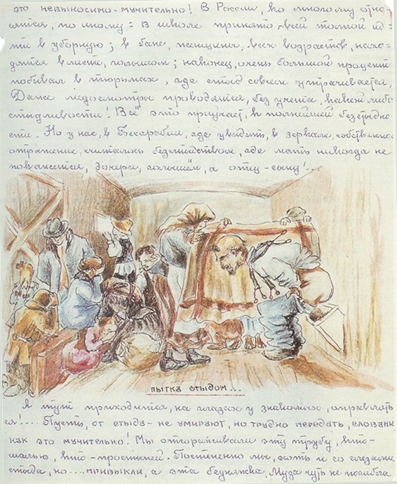 Color sketch from Evfrosiniia Kersnovskaia's self-illustrated memoirs of the interior of a prisoner railcar. The image shows passengers on a crowded transport train dealing with normal bodily functions while trying to maintain some sense of the privacy of regular life by holding up a blanket. Kersnovskaia writes in the accompanying text that for people from Bessarabia it was a real torture to deal with these "necessities" in a railcar, because they were brought up to believe that all nakedness was shameful.