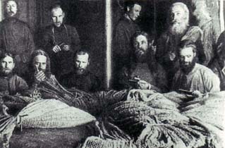 Black and white photograph of Russian Orthodox priests creating fish nets in a workshop. Clergy constituted the bulk of the workers in this workshop at the Solovki Camp.