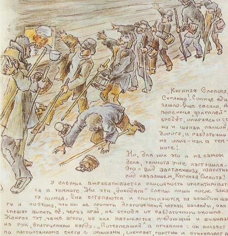 Color sketch from Evfrosiniia Kersnovskaia's self-illustrated memoirs that depicts a group of blind prisoners lining up for food. Malnutrition and vitamin deficiency caused many cases of blindness, often referred to as night-blindness. She described how night-blinded camp inmates tried to finish eating their food near the food delivery window.