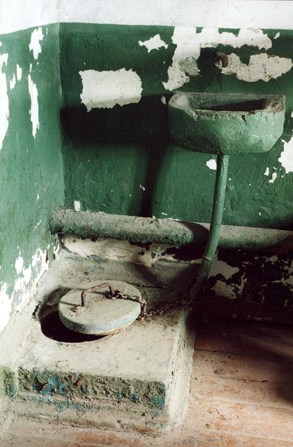Color photograph of toilet facilities (consisting of a hole in the floor) in a punishment cell at Perm 36.