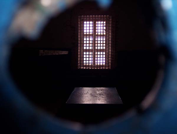 Color photograph looking through the peep hole of a cell door in the punishment cell block at Perm 36. Prisoners would be sent from the regular barracks to the poorly heated, dank punishment cell block (the ShIZO or Penalty Isolator) for violations of camp discipline, failure to fulfill labor norms, or at the whims of camp guards.