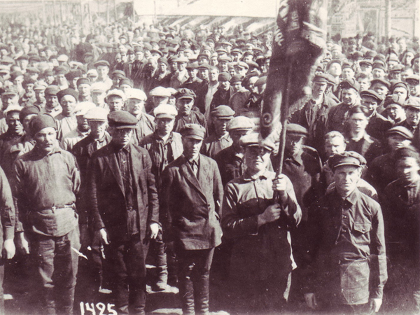 Black and white photograph of the Belomorkanal Camp meeting of builders. Gulag camps frequently used such meetings trying to motivate their prisoner laborers to work harder.