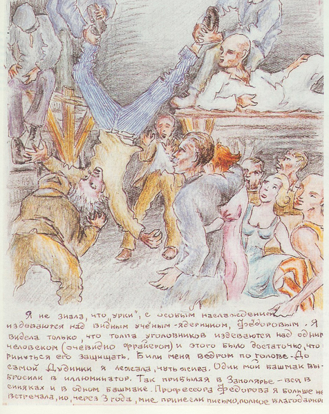 Kersnovskaia drawing of conflict between criminal and political prisoners in a barracks. She recalled that urki(criminal prisoners) maltreated the famous scientist, Fedorov. Kersnovskaia tried to defend him, but criminals beat her severely. Many years later, Kersnovskaia received a letter of thanks from Federov for her having the bravery to defend him.