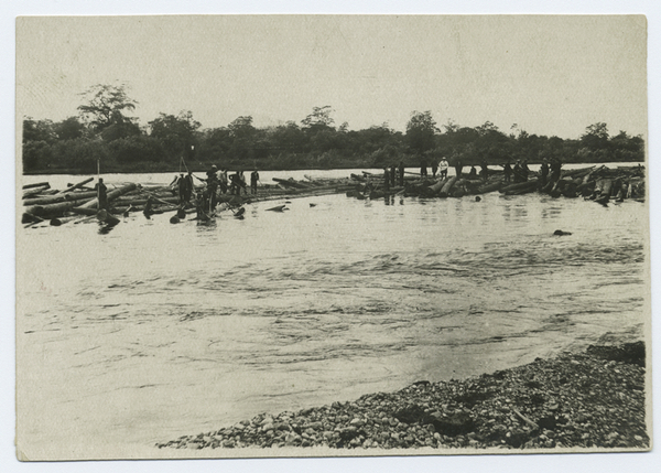 Black and white photograph of prisoners standing on logs in the middle of a stream. After sending logs downstream to their destination, prisoners use long poles to gather the logs together and retrieve them from the water. This work could be incredibly cold and often dangerous to a prisoner's health.