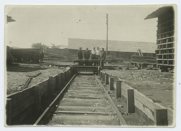 Black and White photograph of railroad tracks running down the center of the image. In the background five men stand posed behind a wheeled dolly loaded with lumber. They are surrounded by stacks of lumber and wooden buildings. A sixth man stands on the far left.