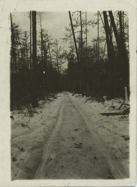 Black and white photograph of road leading into the woods of a Gulag timber camp. The road and the landscape are covered in snow.