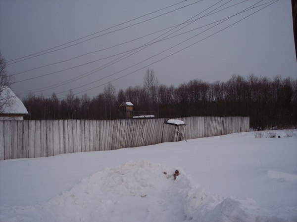 Color photograph showing the perimeter fence surrounding Perm 36 in winter. High wooden fence with buildings and guard tower are visible behind the fence.