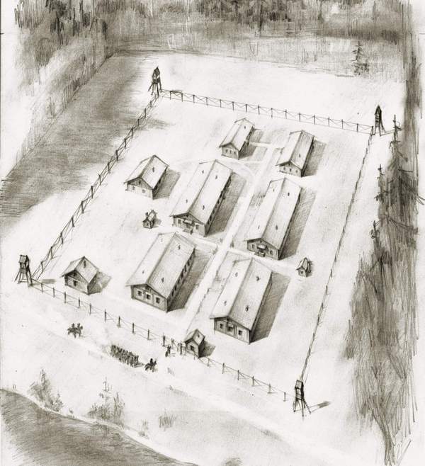 Illustration of camp at what became known as Perm 36 as it appeared from 1946-1950 showing guards on horseback marching prisoners down the road.