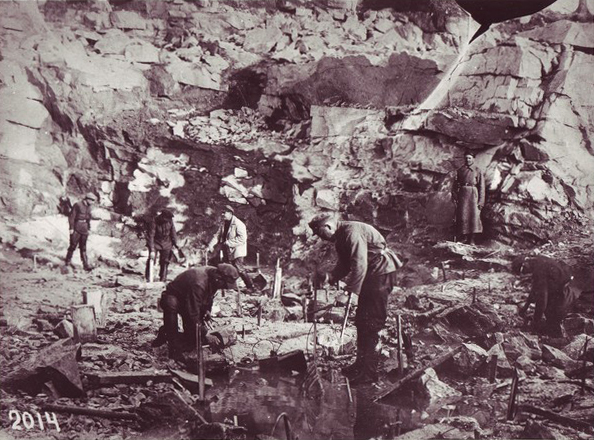 Black and white photograph of prisoners breaking up rock and preparing for placement of explosives at Belomorkanal Camp.