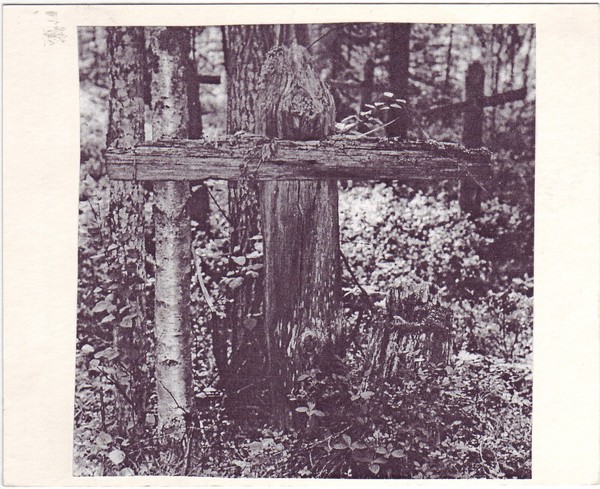 Photograph of wooden cross taken in forest at Obelusat Cemetery near Lake Stanovoi, Solovki.