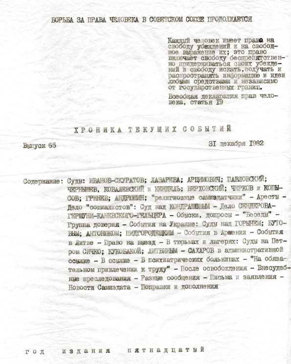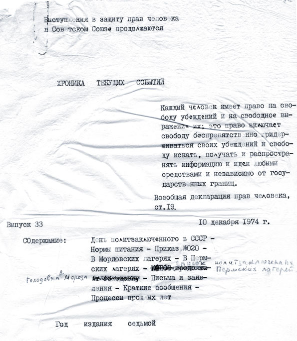 Courtesy of the International Memorial Society.Human rights activists managed to publish the Chronicle of Current Events, an underground samizdat human rights bulletin, continuously from 1968 to 1982 despite violent persecution of its creators and distributors in labor camps and forced psychiatric imprisonment. The Chronicle documented human rights violations throughout the Soviet Union.