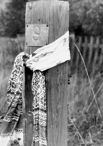 This is the camp grave site of Vasyl Stus in 1988. Political prisoners who died in the camps were buried in the special camp cemeteries. Only the prisoner identification number on the tin plate nailed to the grave site’s post marks where his body lies. Friends and relatives of the poet tied the embroidered Ukranian towel to the post.