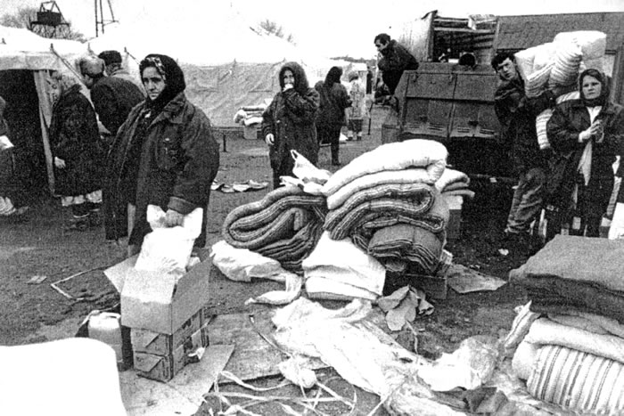 Memorial Society activists providing humanitarian aid to Chechnyan refugees, Iman Refugee Camp, Ingushetia, Russia, 1999.