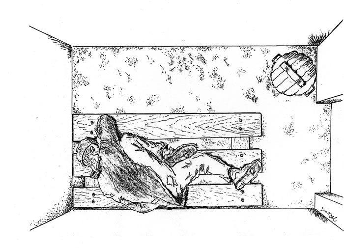 “A lesson to learn: How to distribute your body on the planks trying to avoid excessive suffering? A position on your back means all your bones are in direct painful contact with wood... To sleep on your belly is equally uncomfortable. Until you sleep on your right side with your left knee pushed against your chest, you counterbalance the weight of your left hip and relieve the right side of your rib cage. You leave your right arm along the body, and put your right... cheekbone against the back of your left hand.”