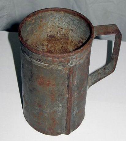 Camp mug from labor camp Bugutychag, Kolyma, 1930s. Originally manufactured as a kerosene measuring cup, this mug is unusually durable. It was probably stolen from the camp workshop by a prisoner to use as his personal mug.
